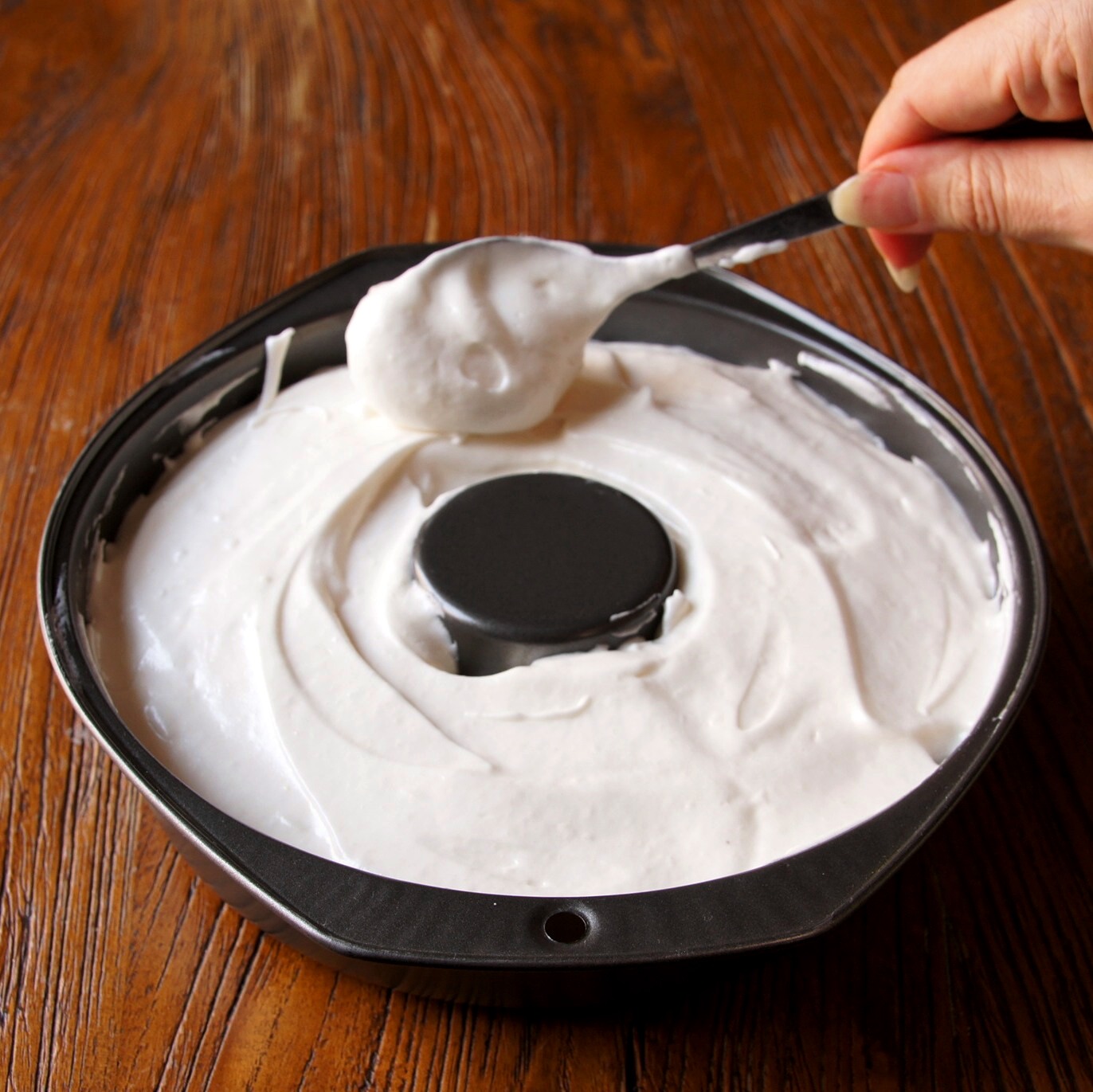 Published 16/03/2015 at 1372 × 1371 in Almond Angel Cake with Amaretto Cream Spoon into the cake tin ← Previous Next →