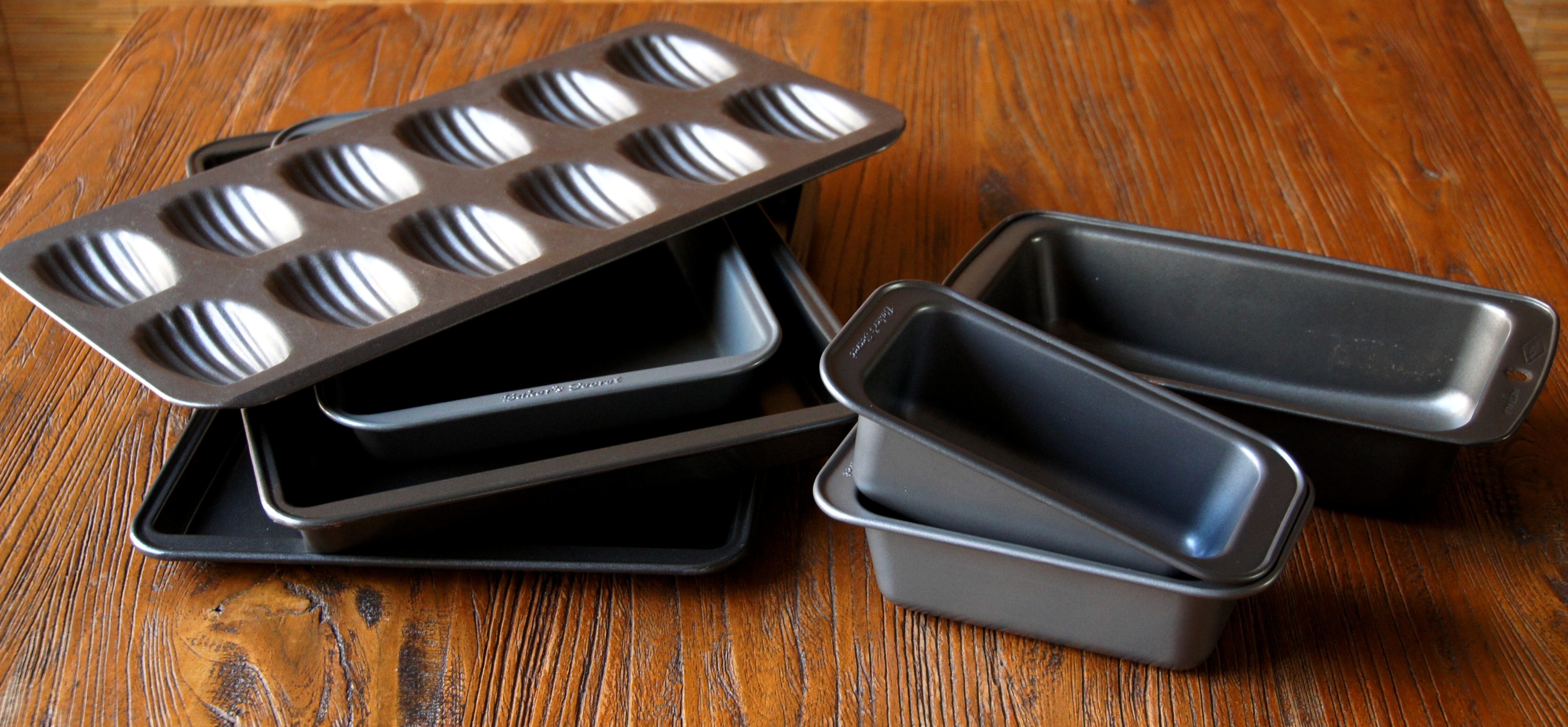 Baking trays are good for cookies, roulades, layered slices, shortbreads and biscuits. I also like the simplicity of madeleines, so tray of maleleine moulds comes handy. Banana bread and other fruit/vegetable delights such as Zucchini&Walnut Cake are best-suited for loaf tins (or bar cake pans).