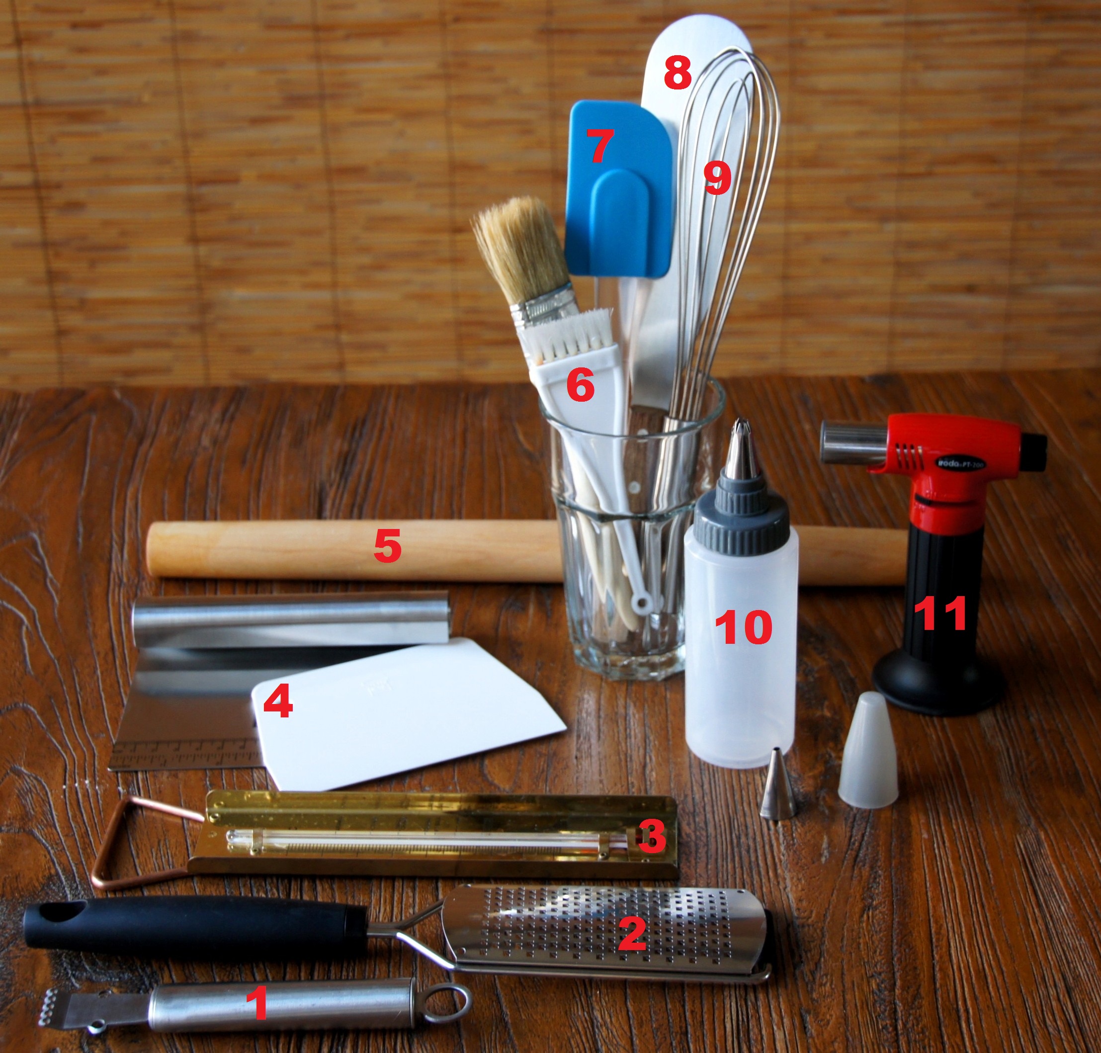 1. Citrus zester 2. Grater 3. Candy thermometer 4. Pastry and dough cutter 5. Rolling pin 6. Brushes 7. Silicon spatula 8. Metal spatula 9. Wire whisk 10. Piping bottle 11. Torch